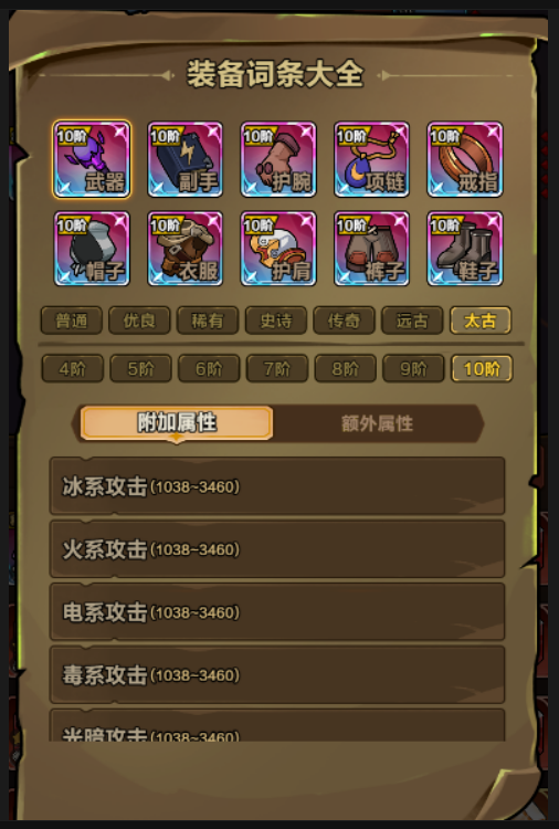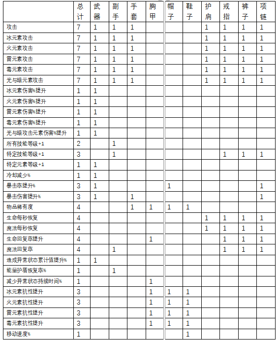 各个装备词条中,攻击、元素伤害,技能等其他词条属性分布:
