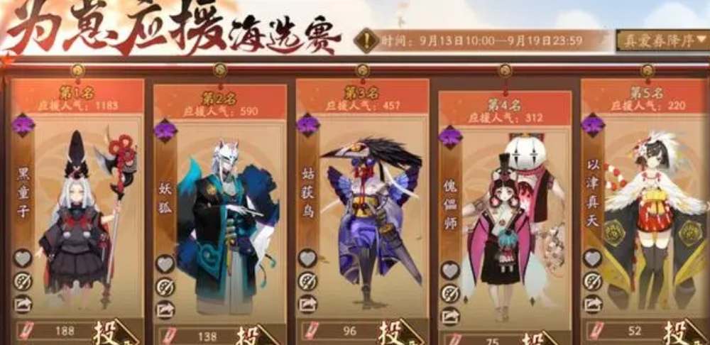 天照票数领先稳居第一位,其次第二是SP大蛇,不知火第三,SP三尾狐第四,第五则是SSR玉藻前。